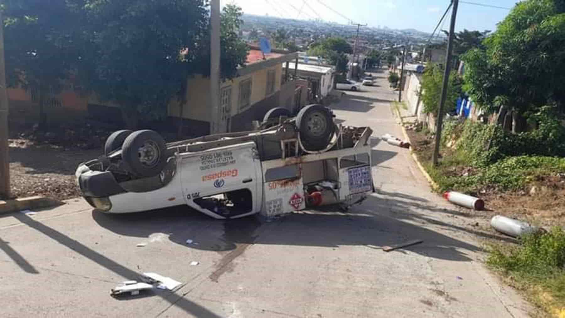 Una camioneta repartidora de conocida empresa de gas causó la movilización del cuerpo de bomberos tras volcar en una de las calles de la colonia Flores Magón en la ciudad de Mazatlán.