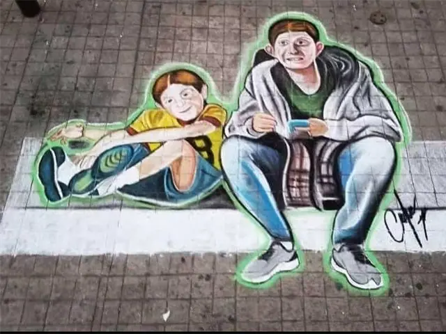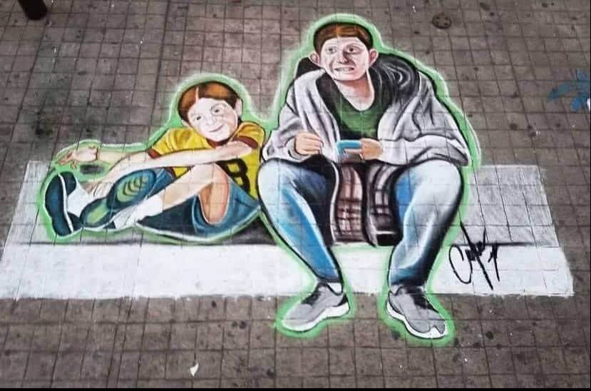 Juan Carlos Leyva, artista gisero pintó en una de las calles del centro de la capital del estado dos imágenes en donde aparece «Benito» de niño y otra imagen actual.