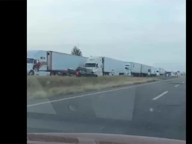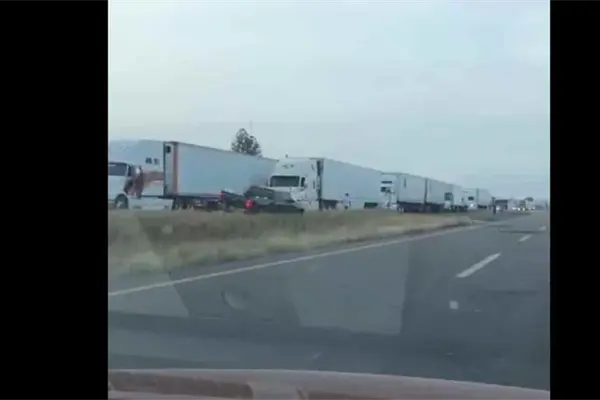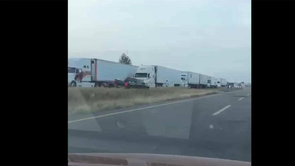 Automovilistas y seguidores de Luz Noticias reportaban a través de videograbaciones la larga cola de decenas de tráileres y unidades motrices, que se alargaba por varios kilómetros, hasta el ejido Venustiano Carranza.