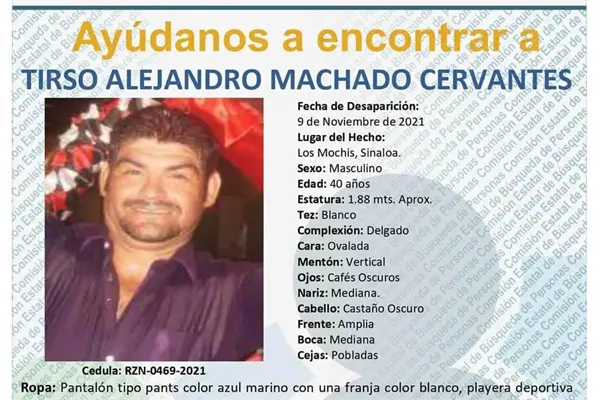 Desde el 9 de noviembre pasado, Tirso Alejandro Machado Cervantes se encuentra desaparecido, por lo que familiares y amigos solicitaron el apoyo de la población para dar con su paradero, pues temen por su integridad física.