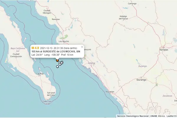«Magnitud de 4.8 el día a las 20:31:36 (hora centro) a 105 km al SUROESTE de LOS MOCHIS, SIN Lat: 24.91° Long: -109.36° Prof: 10 km», señaló el informe.