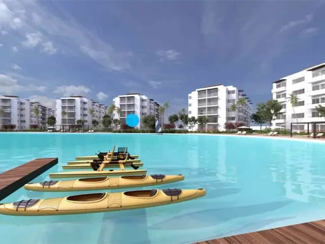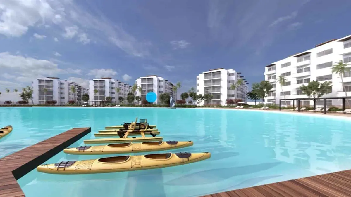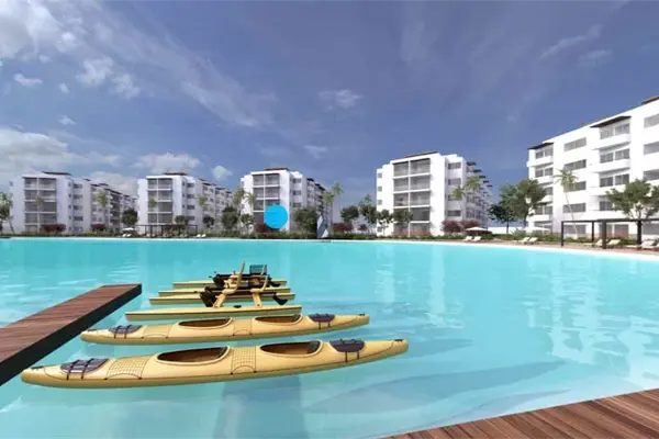 Este complejo incluye nada más y nada menos que un lago y una playa artificial con agua cristalina y arena blanca dentro de sus instalaciones. Desde luego acompañada por sus albercas secundarias, jardines, ciclopuertos y andadores.