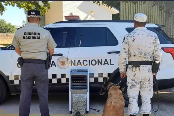 Perros entrenados de la Guardia Nacional detectaron un paquete de aparente mariguana escondido nada más y nada menos que en el interior de un aire acondicionado portátil.