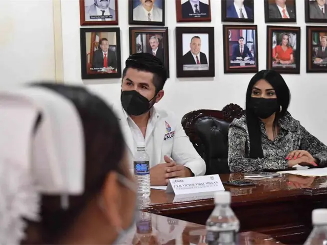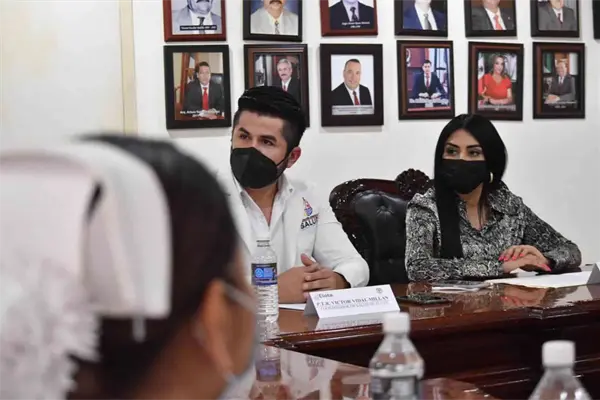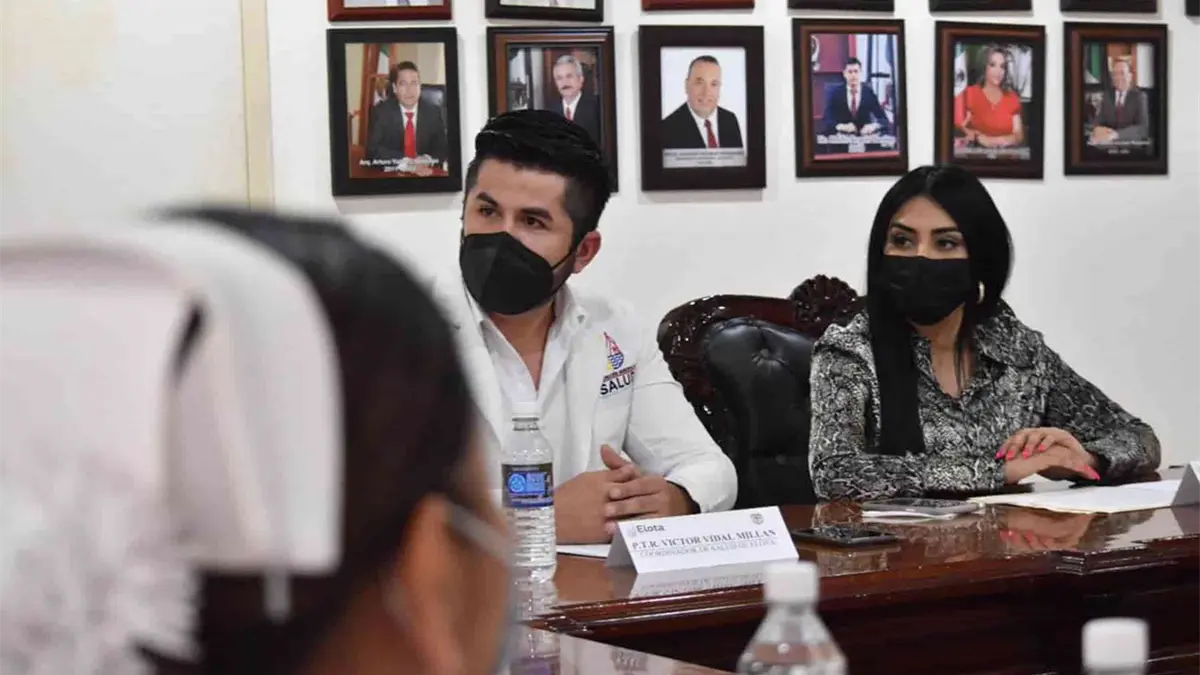 La alcaldesa Ana Karen Val Medina, acompañada del director de Salud, Víctor Alfonso Vidal Millán, y la coordinadora de Comercio, Cintia Barraza Ferro, dio a conocer las acciones para contener los contagios de Covid-19 y su variante Ómicron.