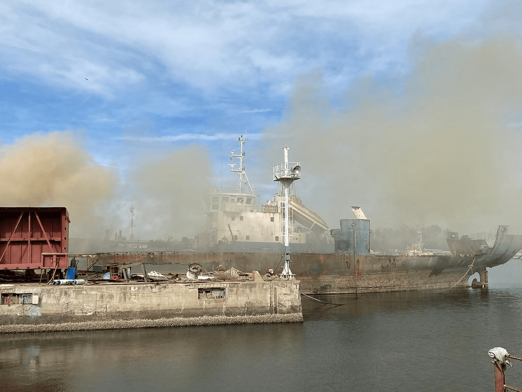 Después de que la zona fue declarada fuera de peligro, se informó que el fuego inició presuntamente por un chispazo mientras se cortaba el metal del barco.