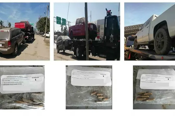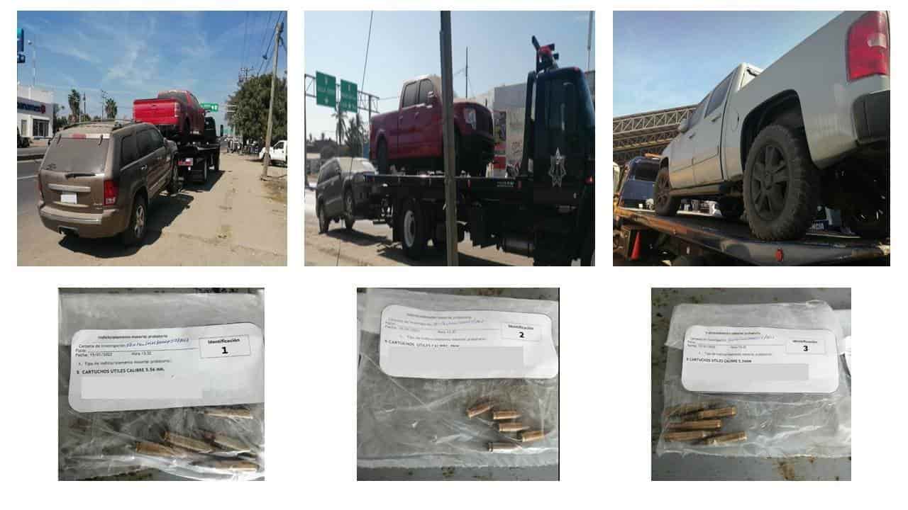 En el interior de las tres camionetas se encontraron 15 cartuchos: 10 de éstos para arma calibre 5.56 milímetros y el resto para calibre calibre .9 milímetros, utilizados principalmente en pistolas cortas.