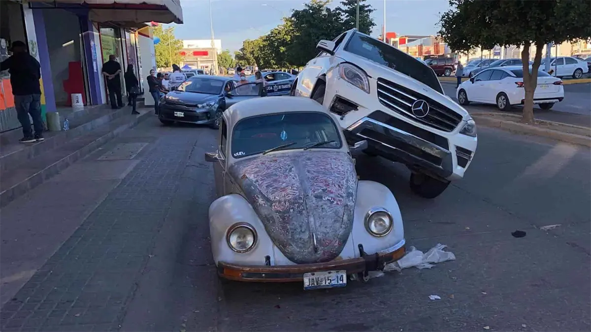 De acuerdo con la información, una camioneta Mercedes Benz, conducida por una mujer, y que iba acompañada de tres menores de edad, perdió el control del volante e impactó contra un auto KIA estacionado y, posteriormente, la fuerza del choque provocó que quedara arriba de un «bochito».