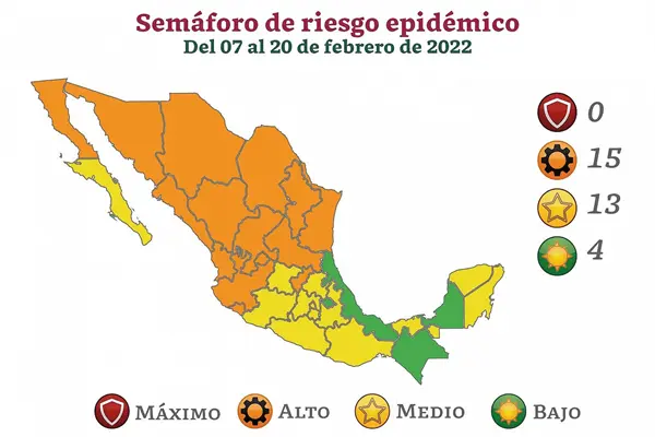 La Secretaría de Salud a nivel federal informó que, a partir del día lunes 7 de febrero, al menos 15 estados del país pasarán a semáforo epidemiológico color naranja debido al incremento de contagios que se han venido registrando durante las últimas semanas a lo largo país; esta categoría la mantendrán hasta el día 20 de febrero.