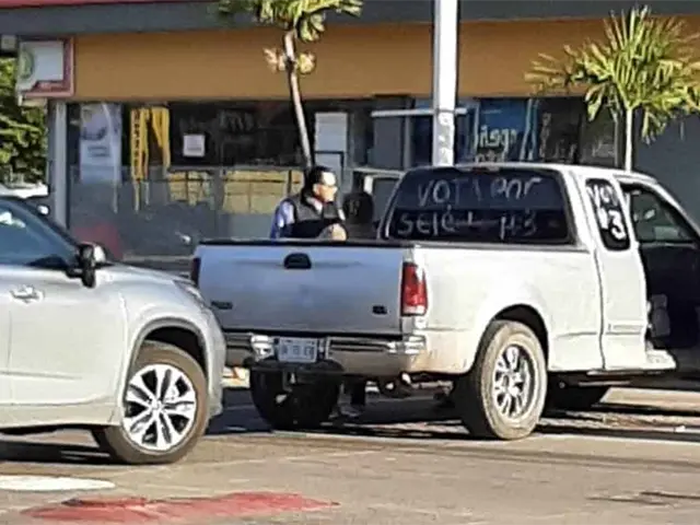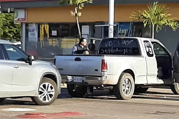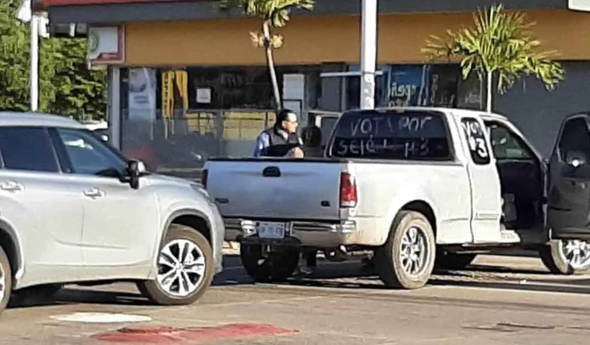 La queja fue interpuesta con fotografías como prueba, donde se observa a Domingo Vázquez entablando un dialogo con la candidata en el estacionamiento de una conocida cadena de tiendas de autoservicio, mientras la camioneta de la aspirante a síndico municipal muestra claras señas de estar en plena campaña.