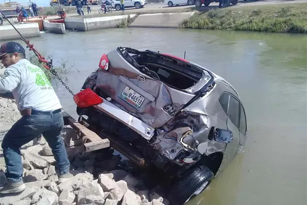 Posteriormente, con ayuda de una grúa rescataron el vehículo del canal lateral 18 y fue trasladado a la pensión municipal.