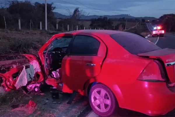 El conductor invadió carril y se estrelló contra un tracto camión, llevando claramente desventaja el carro tipo sedán, el cual quedó destrozado de la parte lateral de lado del chofer.