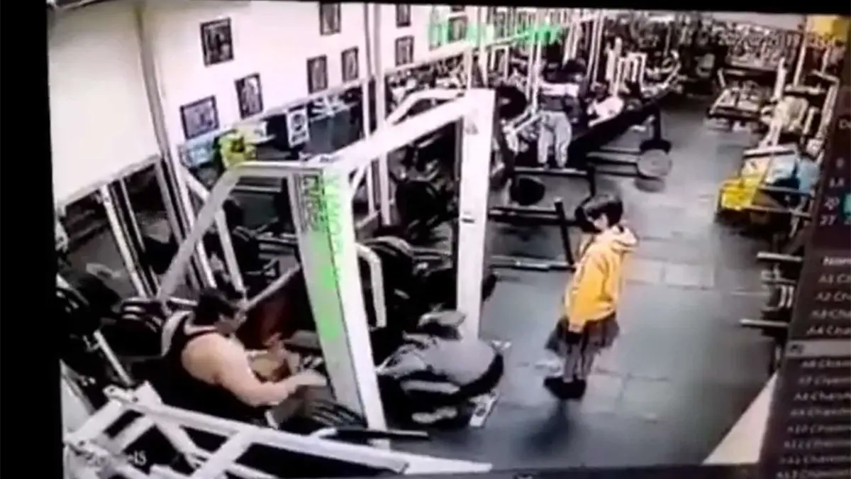 Una cámara de videovigilancia del gimnasio captó el momento justo en el que la mujer, vestida de negro con gris, se hacía acompañar de otra mujer visiblemente más joven vestida con suéter amarillo y falda, mientras realiza su rutina de ejercicios.