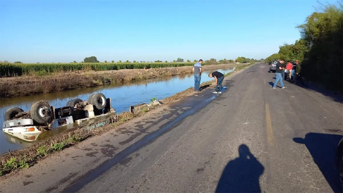 Una góndola término volcada dentro del canal El 7, tras un accidente automovilístico, la mañana de este sábado a la altura del Aeropuerto Internacional de Culiacán.