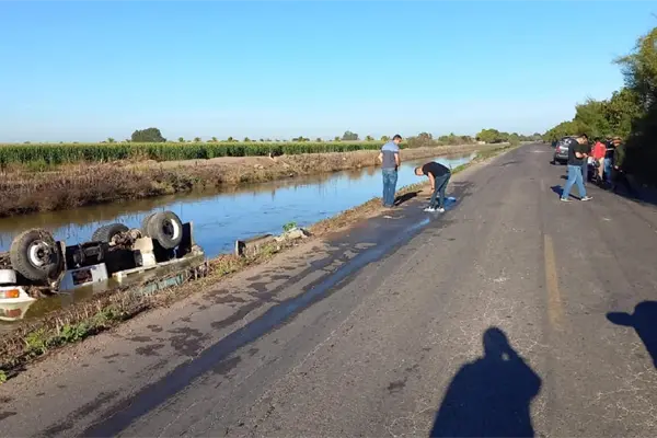 Tras el encontronazo la pesada unidad terminó con las llantas hacia arriba dentro del canal.