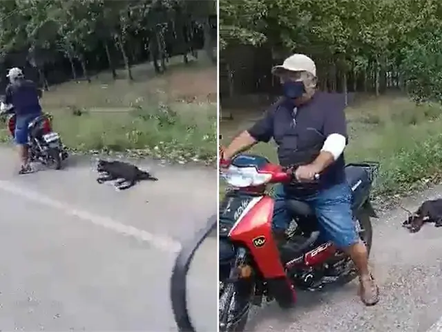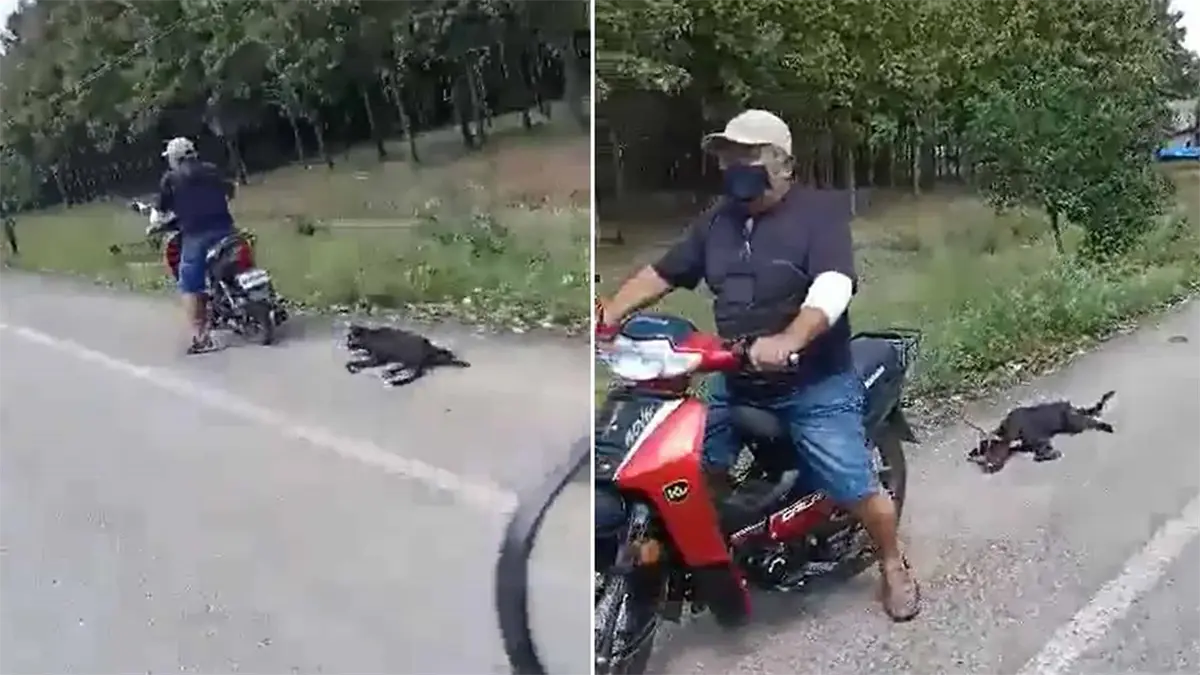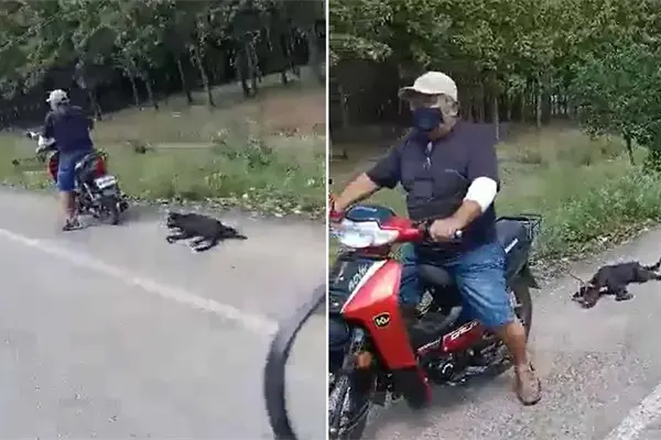 Usuarios de redes sociales han viralizado un video donde se observa a un sujeto abordo de su motocicleta mientras lleva amarrado a un perro al que prácticamente va arrastrando por la carretera.
