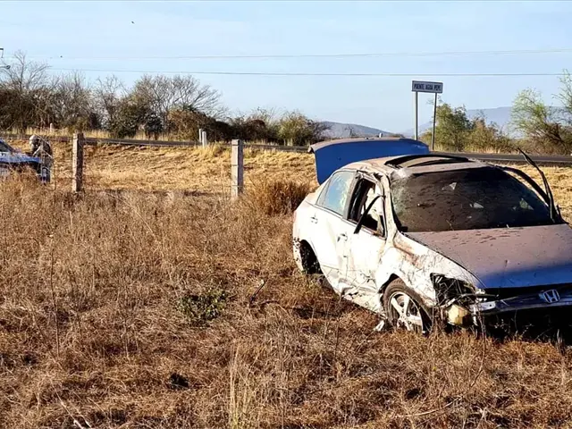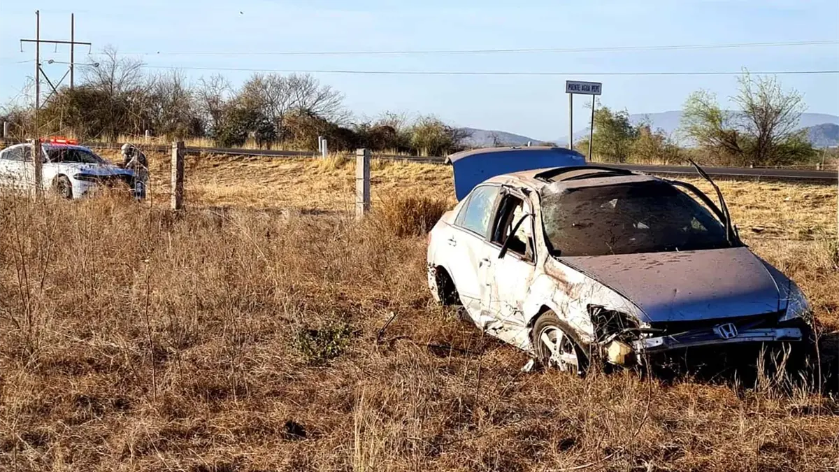 El vehículo siniestrado es un Honda Accord, de color gris, que por razones desconocidas se salió de la carretera y terminó volcado en un terreno agrícola, aproximadamente a unos 70 metros de la carretera México 15.