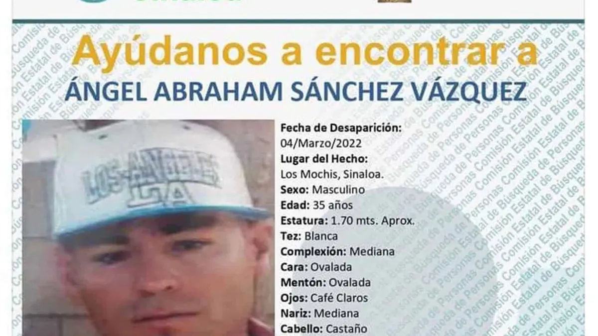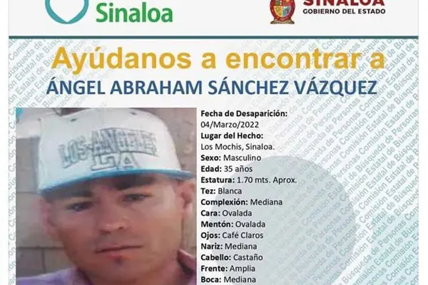Según la ficha emitida por la Comisión Estatal de Búsqueda de Personas Desaparecidas en Sinaloa, se trata de Ángel Abraham Sánchez Vázquez, de 35 años de edad, quien fue privado de su libertad, a las 20:40 horas del pasado viernes 4 de marzo, mientras se encontraba en su domicilio ubicado en la colonia Infonavit Morelos.