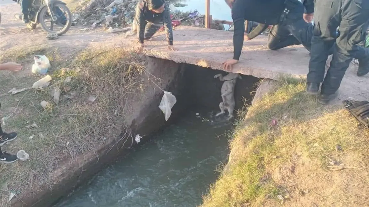 Policías rescatan a Güero, un perrito que cayó a un canal en el ejido Flores Magón