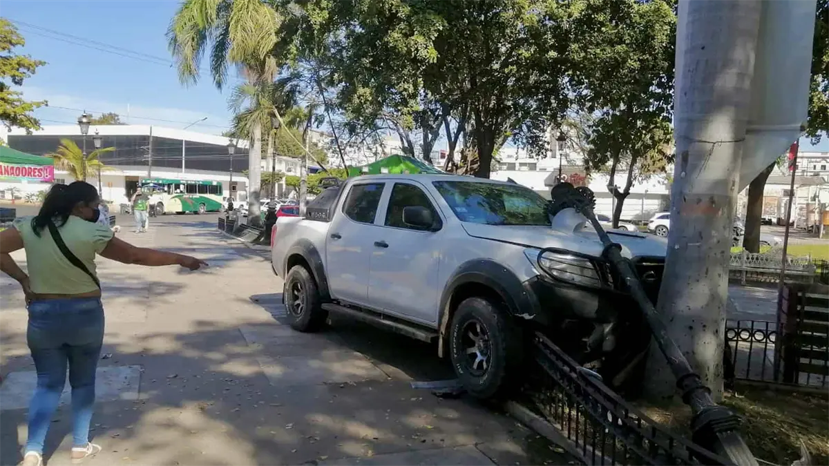 Tras el encontronazo, el conductor de la unidad pickup perdió el control y se impactó, en primer lugar, con los bolardos que se encuentran ubicados en la entrada de la plazuela, siguió y golpeó la estructura de fierro de los jardines hasta terminar impactado con una palmera, a unos metros del kiosco principal.