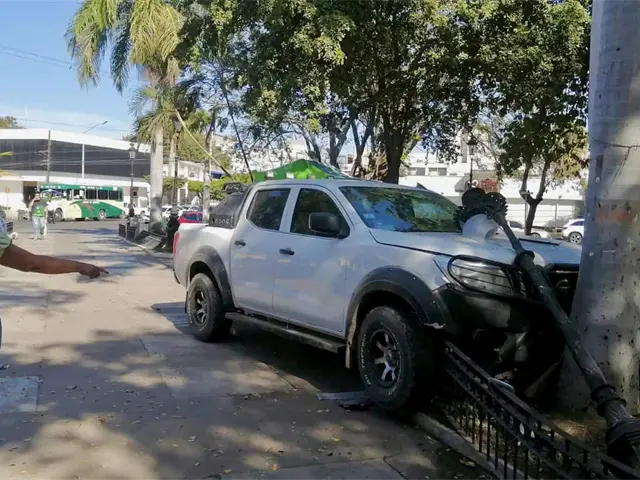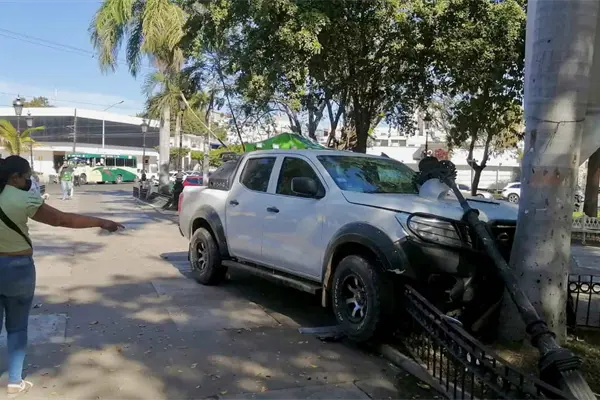 Tras sufrir un accidente automovilístico, una camioneta terminó chocando contra una palmera, ubicada dentro de la Plazuela 27 de septiembre, en Los Mochis.
