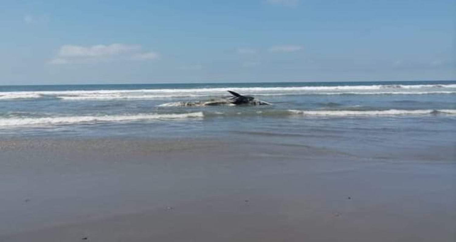 En cuerpo en estado de descomposición de una ballena quedó encallado la mañana de este sábado en la playa El Vigia, perteneciente a la sindicatura de Eldorado, al sur del municipio de Culiacán.