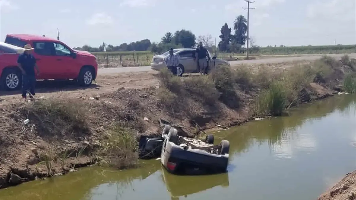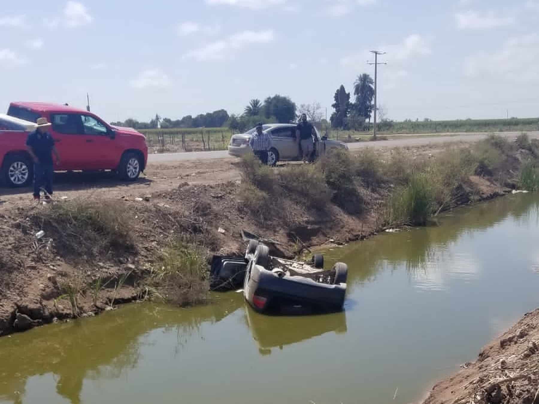 Vuelca automóvil y cae dentro de un canal de riego en Guasave
