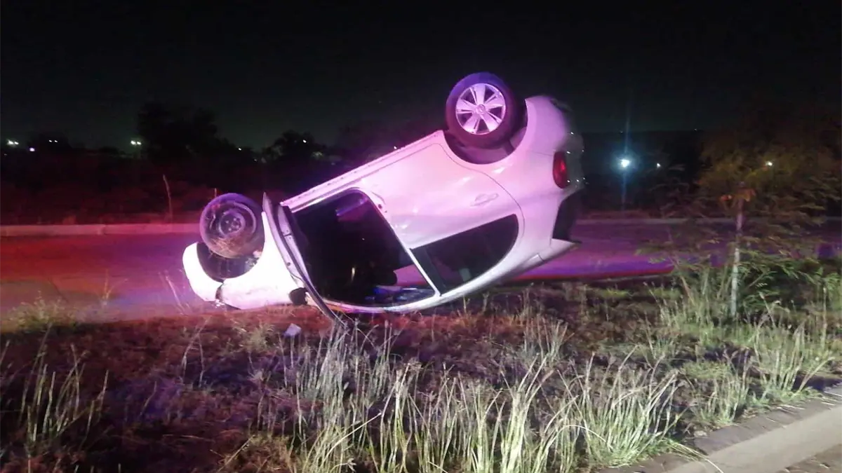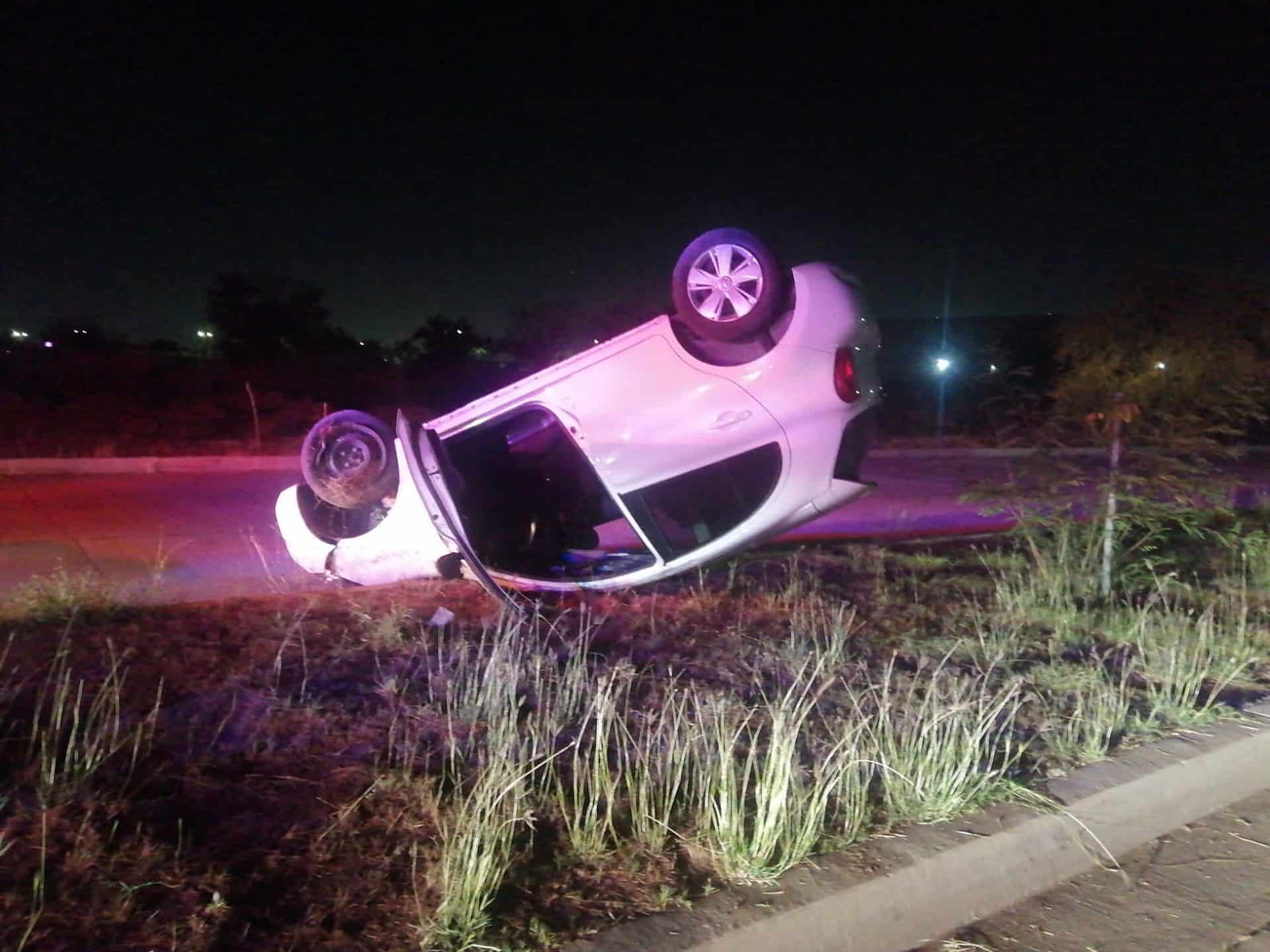 Una pareja de jóvenes resultó con heridas leves tras volcar en su automóvil cuando circulaban en el sector Isla Musala, en la zona oriente de Culiacán.