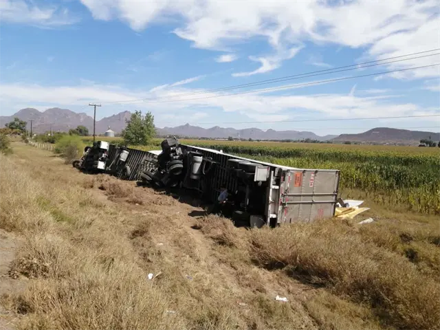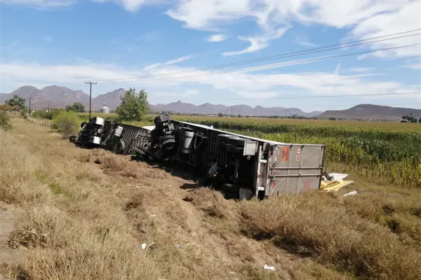 Un tráiler cargado con tomate volcó, la mañana de este viernes, en las inmediaciones de la carretera México 15, muy cerca a la comunidad de San Miguel Zapotitlán, municipio de Ahome.