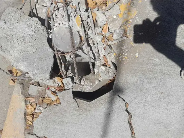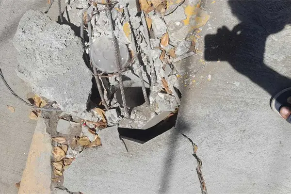 El poste está ubicado sobre la avenida Santa Rosa y, tras el golpe, este perdió parte de sus cimientos y ahora se sostiene sobre la vialidad únicamente con las varillas de su interior.