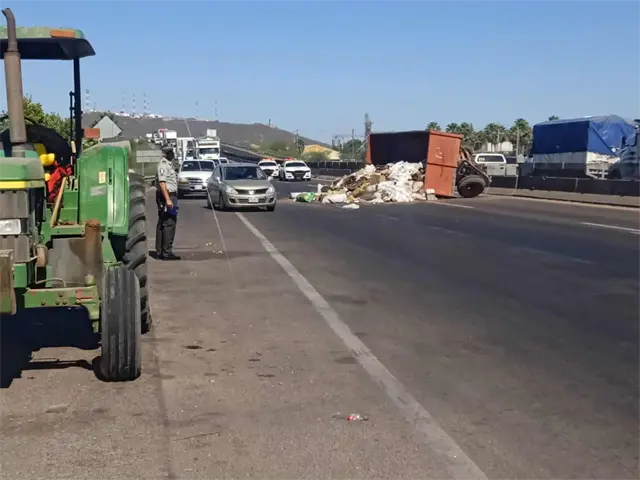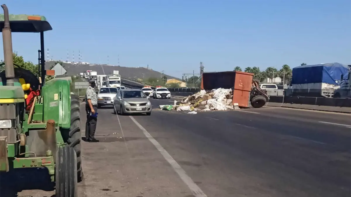 Una tolva, cargada con basura, que era remolcada por un tractor sobre la carretera Internacional México 15 volcó, poco antes del mediodía de este lunes, al sur de la ciudad de Los Mochis; el accidente causó tráfico lento, pero por fortuna el chofer resultó ileso.