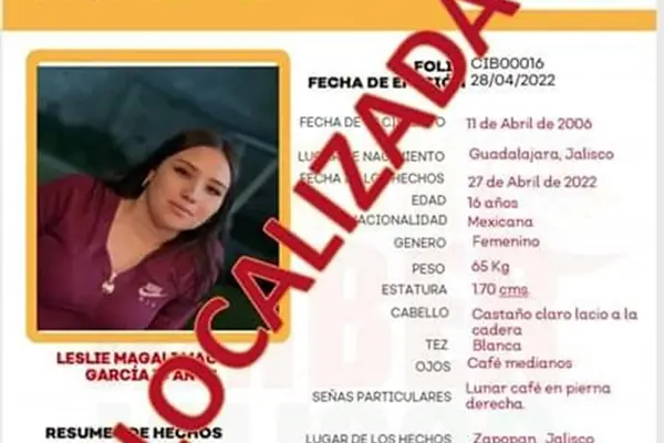 Señaló que por Lesli Magali se activó la Alerta Amber 16/2022/AAJAL este 27 de abril cuando ya no se supo de ella, a quien se localizó en buen estado de salud en la ciudad de Culiacán.