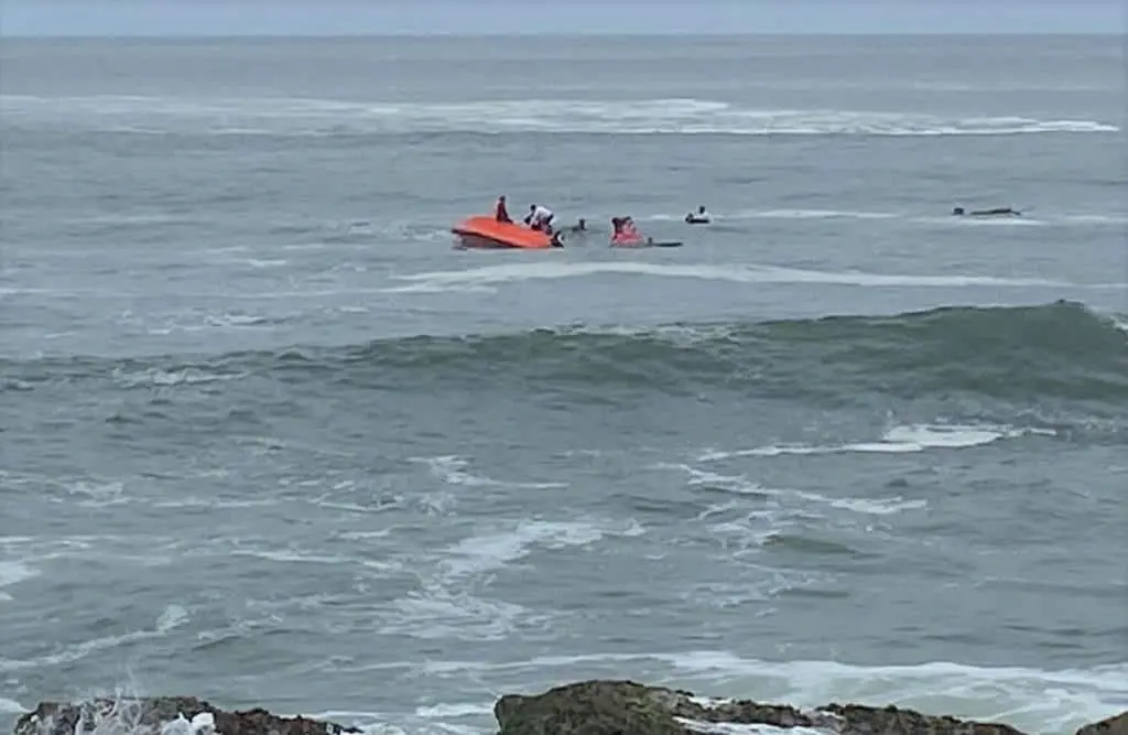 Este sábado por la mañana una embarcación de la Escuela Náutica que realizaba prácticas frente al Parque de las Ciudades Hermanas, fue sorprendida por una ola que volteó la embarcación y sus 7 ocupantes cayeron al mar, informó el Comandante del Escuadrón de Salvamento Acuático, Gustavo Espinoza Bastidas.