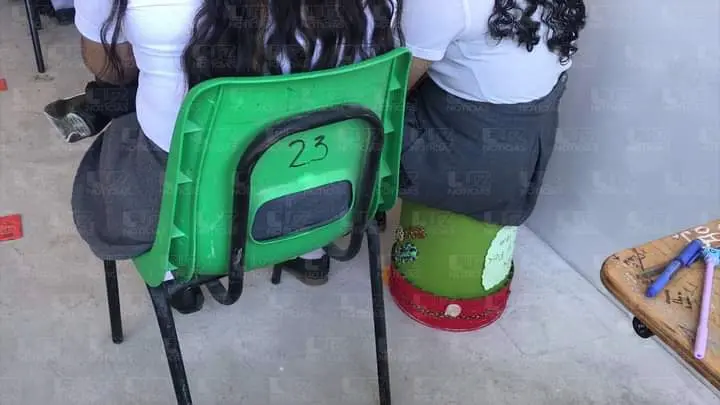 Alumnos toman clases sentados en cubetas en preparatoria en Mazatlán