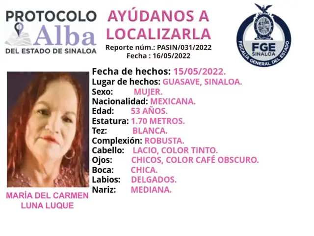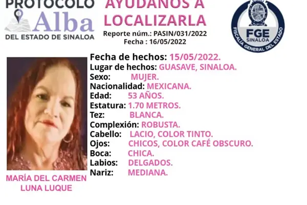 Según la ficha técnica proporcionada por las autoridades, María del Carmen Luna Luque, de 53 años de edad, desapareció en la ciudad de Guasave y la última vez que se le vio fue alrededor de las 12:00 horas del pasado domingo 15 de mayo, cuando salió de un domicilio de la colonia Bugambilias.