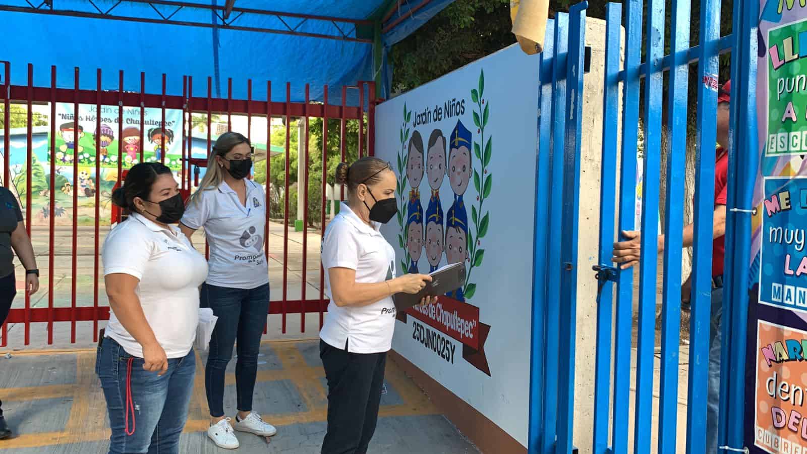 >El sector salud acudió a sanitizar el jardín y platicar con los niños sobre las medidas de higiene; directora llama a papás a no caer en pánico.