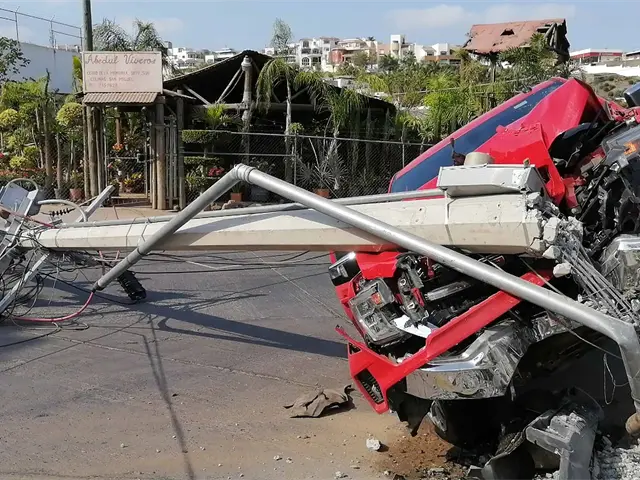 Tras el choque, la camioneta quedó destrozada del frente y el poste cayó al pavimento.