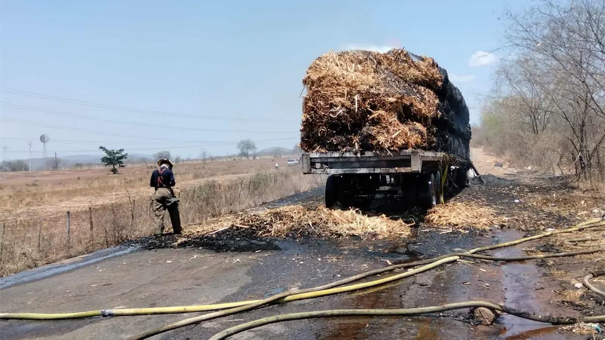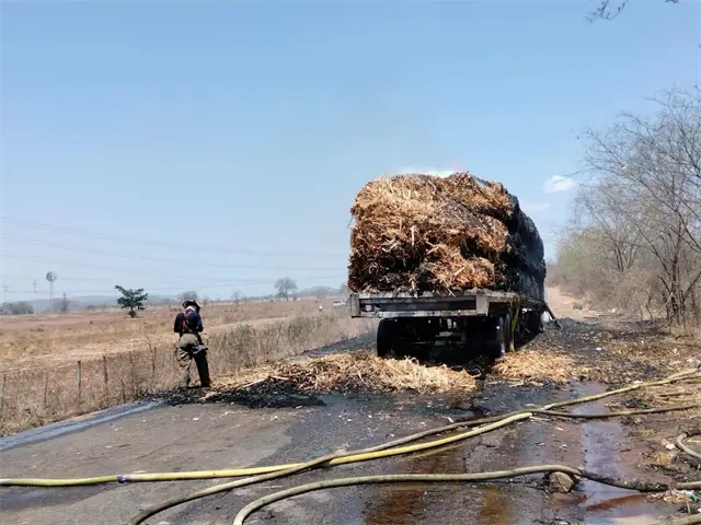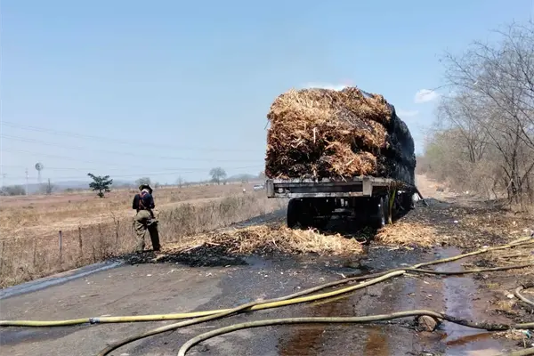 Un tráiler y cientos de pacas de pastura que transportaba quedaron en cenizas cuando circulaba en las inmediaciones de la comunidad de La Laguna Colorada, al sur de Culiacán.