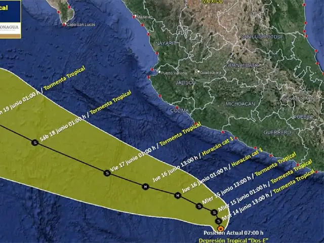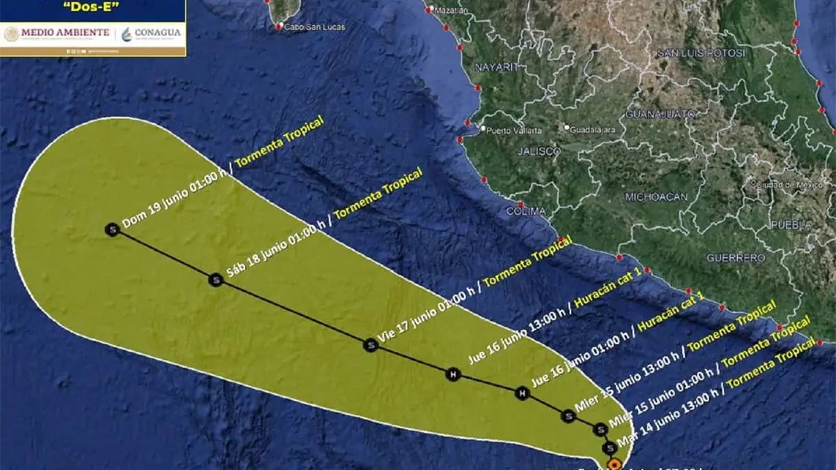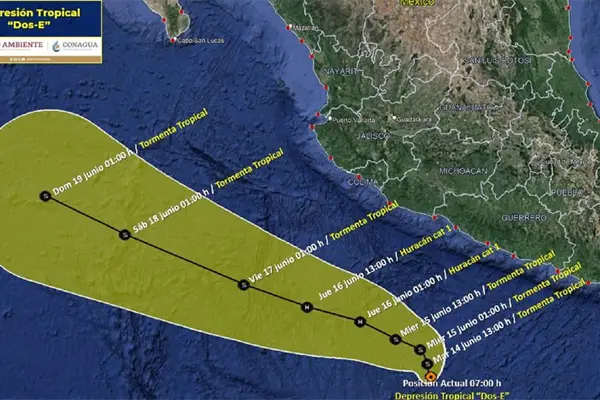 La Depresión Tropical Dos-E, del Océano Pacífico, a las 07:00 horas, tiempo del centro de México, se localizó a 445 kilómetros (km) al suroeste de Acapulco, Guerrero, con vientos máximos de 55 kilómetros por hora (km/h), rachas de 75 km/h y desplazamiento hacia el nor-noroeste a 6 km/h. Se prevé que su trayectoria sea paralela a las costas de los estados del Pacífico mexicano.