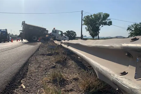 Trascendió que ambas unidades circulaban de sur a norte, cuando presuntamente la camioneta invadió el carril contrario y causó que el camión impactara contra la valla de contención y durante la maniobra el vehículo de mantenimiento de carreteras terminó atravesado entre la carretera y sobre la valla.