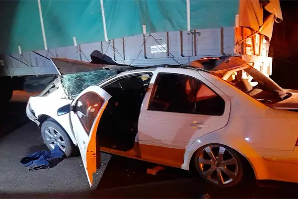 Un joven, que presuntamente circulaba, esta madrugada, bajo los influjos del alcohol, en su vehículo sobre la carretera internacional México 15, con dirección hacia Los Mochis, terminó debajo de un camión cargado con casi 30 toneladas de maíz; se desconoce si no midió la distancia y se impactó por alcance o si se cambió de carril por el estado en el que manejaba.