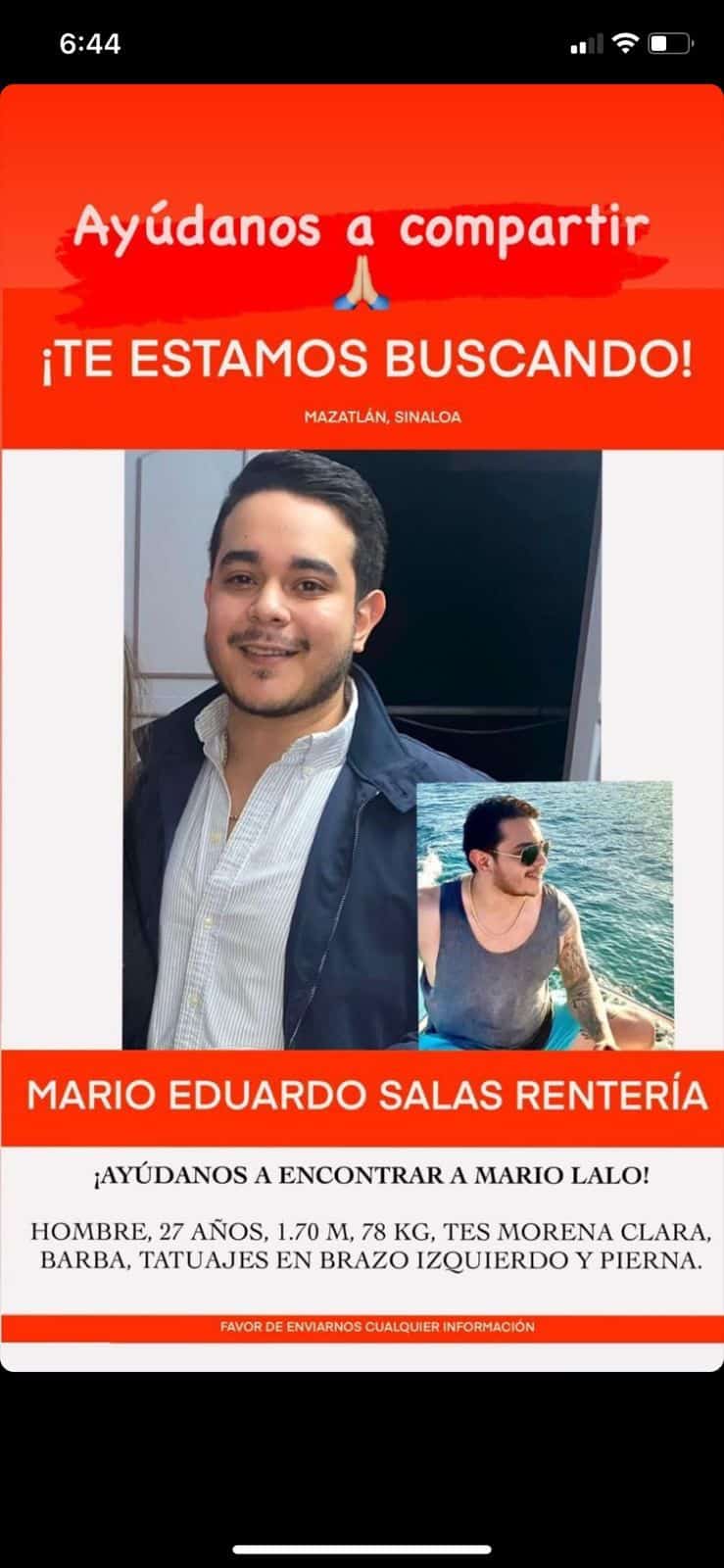 El joven Mario Eduardo Salas Rentería de 27 años de edad, fue levantado el pasado fin de semana en Mazatlán, presuntamente cuando fue a sacar una fuerte cantidad de dinero en el banco en plena Avenida Gaviotas, es decir, en la franja turística del puerto.