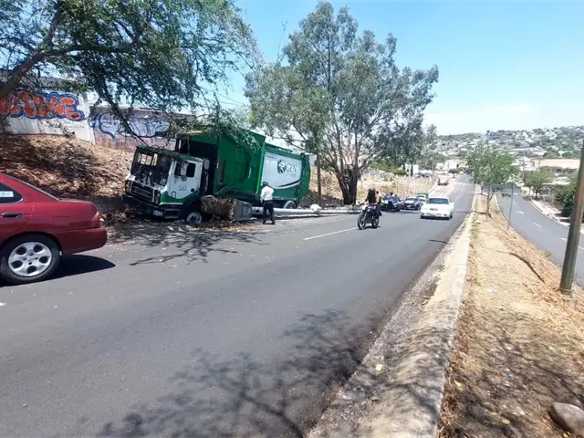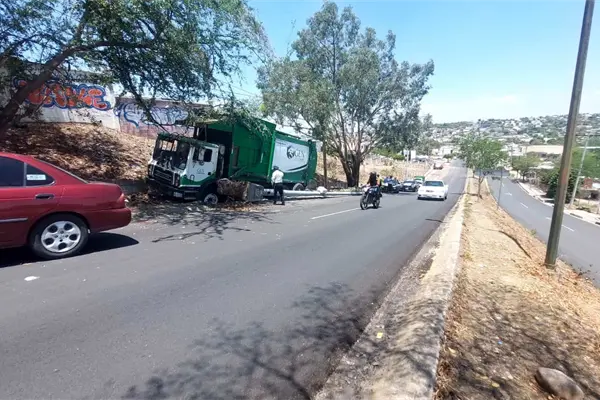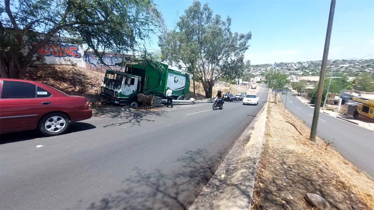 Tras accidente, camión recolector de basura tumba poste de cámaras de seguridad