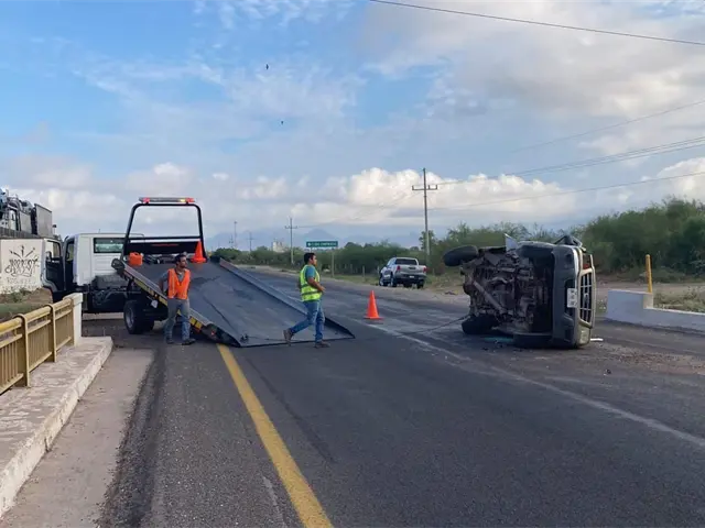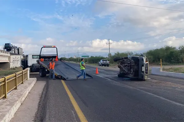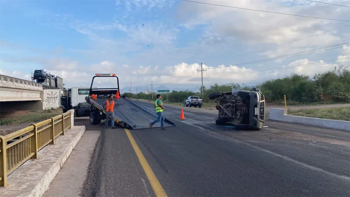 Vuelca una joven en camioneta, frente al ejido Flor Azul