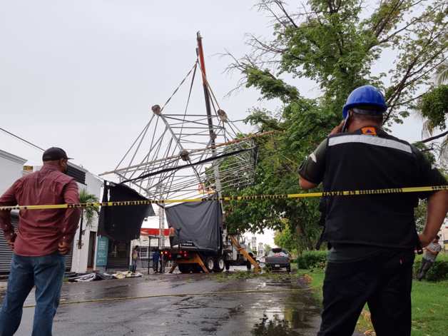 La estructura metálica fue arrancada desde la base por el viento y se detuvo con los árboles y una luminaria que quedó destrozada.