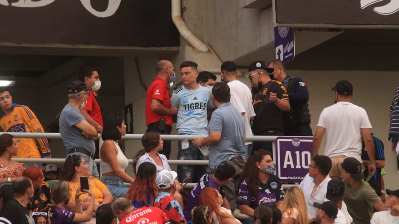 Pleito entre aficionados de Tigres fue el que se vivió en el estadio «Kraken» en pleno partido, cuando dos hombres con la playera de los felinos se hicieron de palabras con elementos de seguridad del estadio y fueron correteados por todo el inmueble.