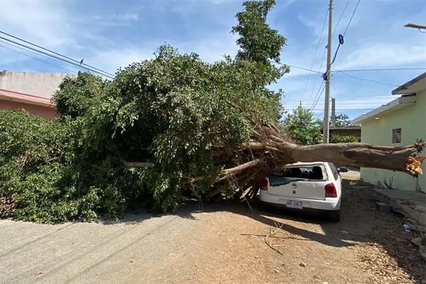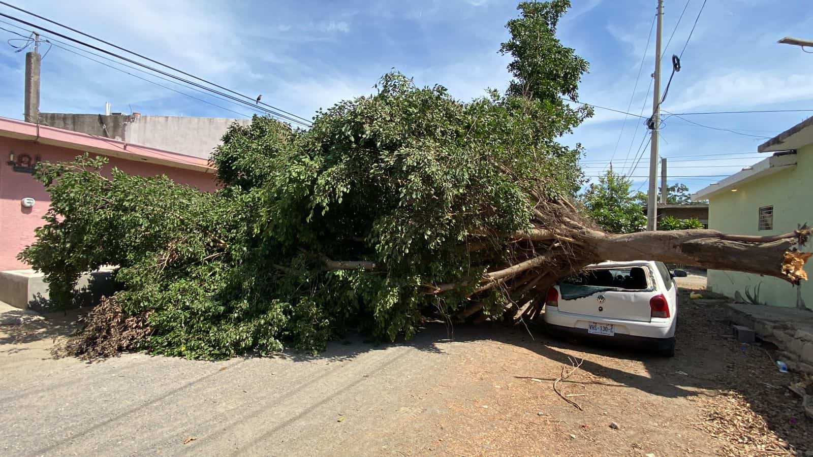 Un árbol viejo y de al menos 12 metros de altura se venció tras las lluvias de esta mañana y cayó sobre un automóvil que estaba estacionado en la colonia Valles del Ejido, en Mazatlán.