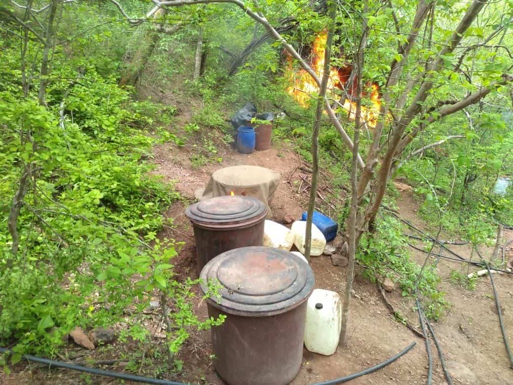 El primer hallazgo se hizo tras recorridos terrestres en Tlachinolpa y se logró asegurar 3,040 litros de tolueno, 600 litros de ácido muriático, 300 litros de etano y 4 reactores metálicos de síntesis orgánica.