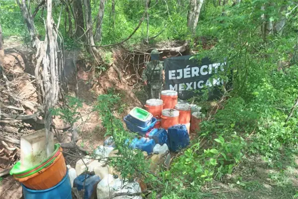 En el campamento de Ayala se aseguraron 20 litros de ácido sulfúrico, 15 litros de tolueno, 13 recipientes de diferentes capacidades, tanques de gas, 3 reactores, 2 condensadores y 1 secadora.
