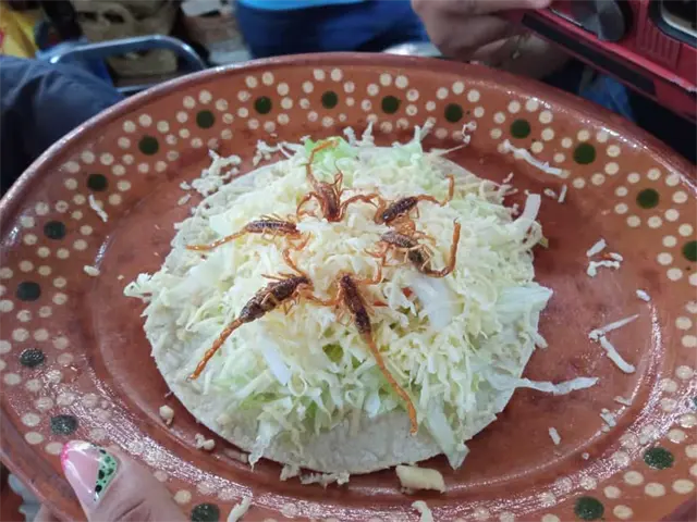 Celia Franco, encargada de este negocio familiar, explicó que el taco lo puedes encontrar en un solo local del recinto, estamos hablando de la fonda «Las margaritas» el cual tiene un precio de 70 pesos, y se prepara con tortilla de maíz, una cobija de lechuga, cebolla, tomate, alacranes y salsas al gusto.