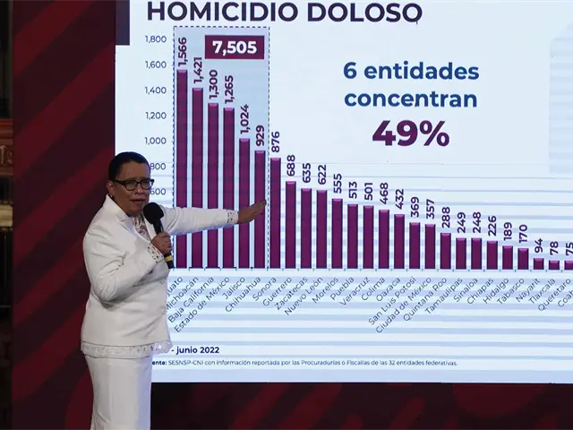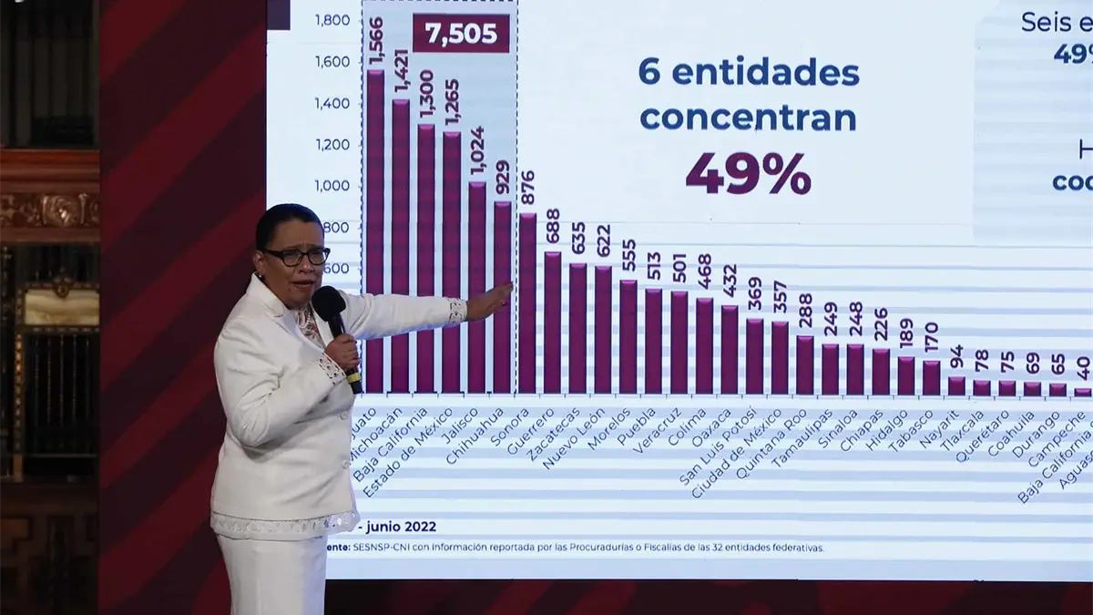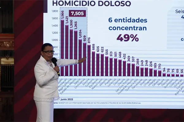 Con estas cifras, detalló la secretaria, México tiene un promedio de 84 homicidios dolosos diarios este 2022, una decena menos que la media de 94 de la primera mitad de 2021.